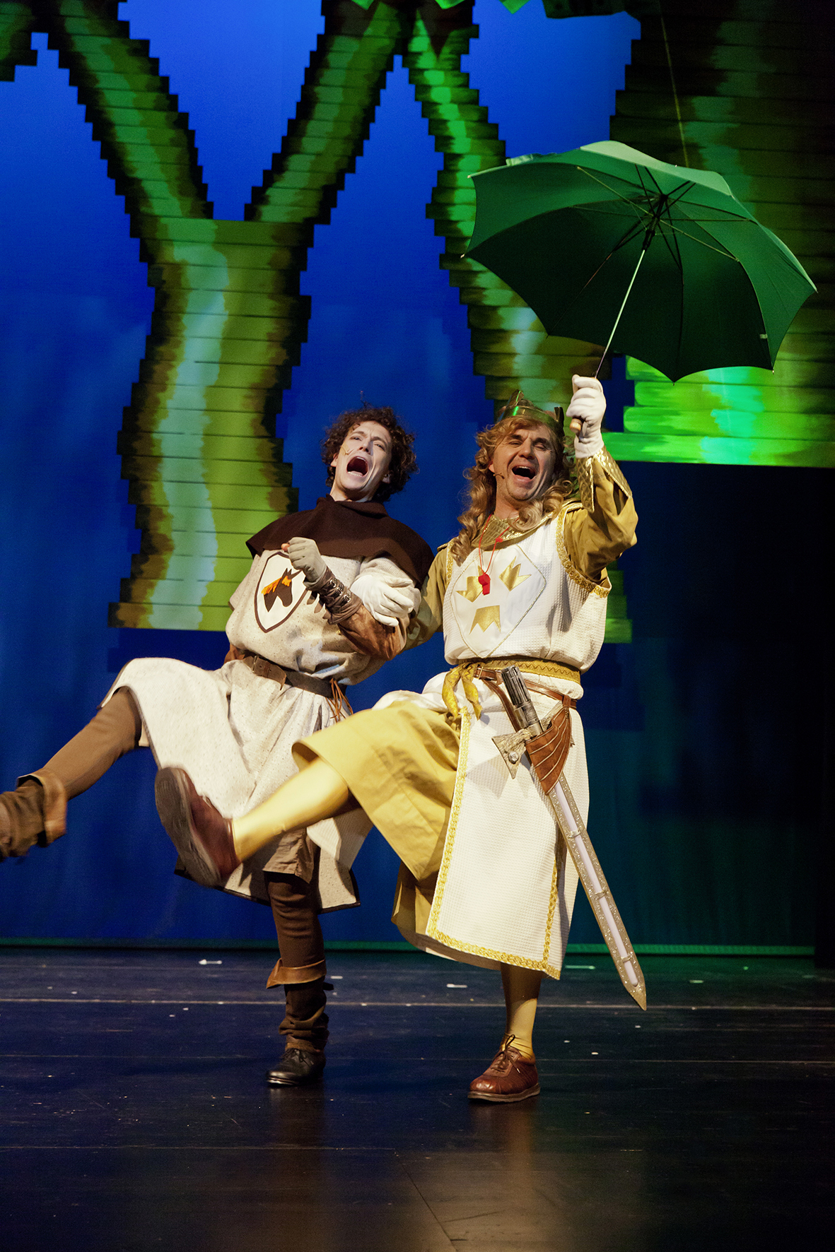 Vier Ritter müssen mit König Arthur den Gral suchen und gemeinsam mit der „Fee vom See“ erleben sie Abenteuer, bis es zum ironisch-lustigen Happy End kommt. Deftig-ironisch-schwarzer Witz ist es auch, der das Stück, genauso wie den Kinofilm, dominiert. Hübsche Lieder, die seicht, aber gut klingen, komplettieren das Gesamtbild: Der „Pitsch-Patsch-Song“ oder das Lied von König Arthur, genauso wie „Das Lied, das jeder liebt!“