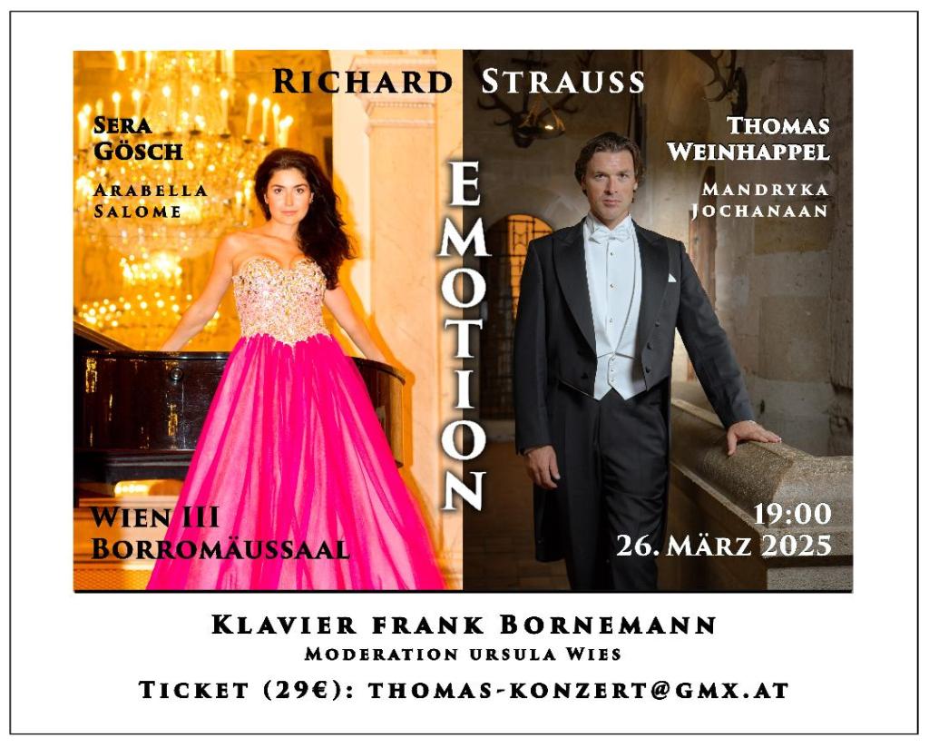 Der niederösterreichische, vielbeachtete Bariton bittet zu (s)einem „emotionalen“ Konzertabend. Er widmet sich demnach wieder Opernrollen, diesmal aus der Feder eines oft gespielten Komponisten. Die Rede ist nicht von Johann Strauss, der ja nur eine einzige Oper geschrieben hat und allgemein bekannt als der „Walzerkönig“ war. Nein. Es ist Richard Strauss, der Opernkomponist, dem Thomas Weinhappel diesmal im 3. Wiener Gemeindebezirk huldigen wird. Und dies keinesfalls alleine. Er hat mit Sopranistin und Gesangspartnerin Sera Gösch – eine österreichische Opernsängerin, international gefeiert, mit türkischen Wurzeln – an seiner Seite.